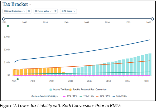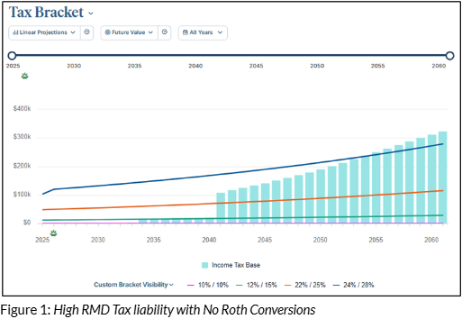 Early planning—including strategic Roth conversions before RMDs begin—can help mitigate these effects, particularly during lower-income years. Converting allows you to spread out your tax liability over multiple years, rather than facing a sharp spike in taxable income once RMDs begin.